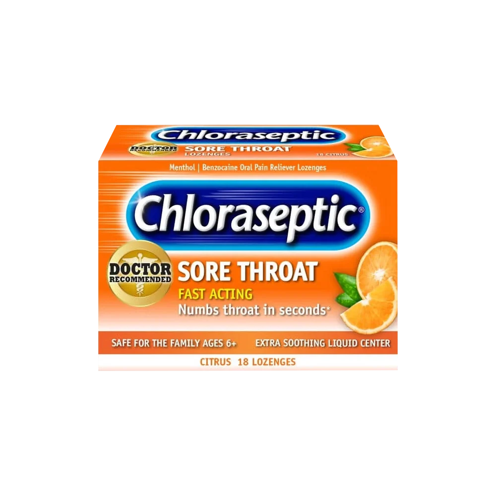 أقراص كلوراسيبتك تحتوي على بنزوكائين الذي يخفف مؤقتًا من التهيج الطفيف، والألم، والتهاب الفم والحلق.