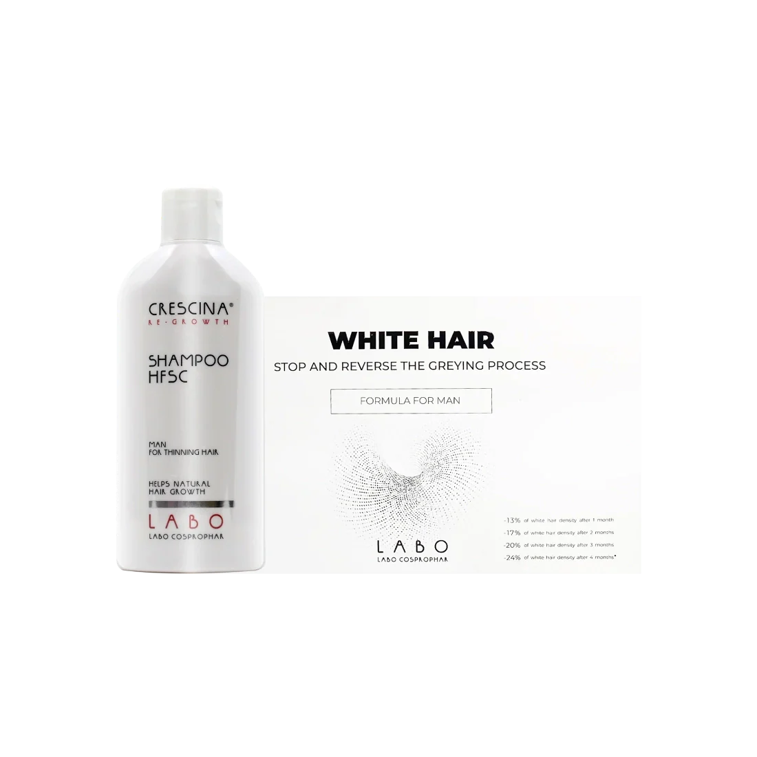 It combines Crescina ampoules for gray hair treatment with Crescina shampoo, delivering strong, vibrant hair.