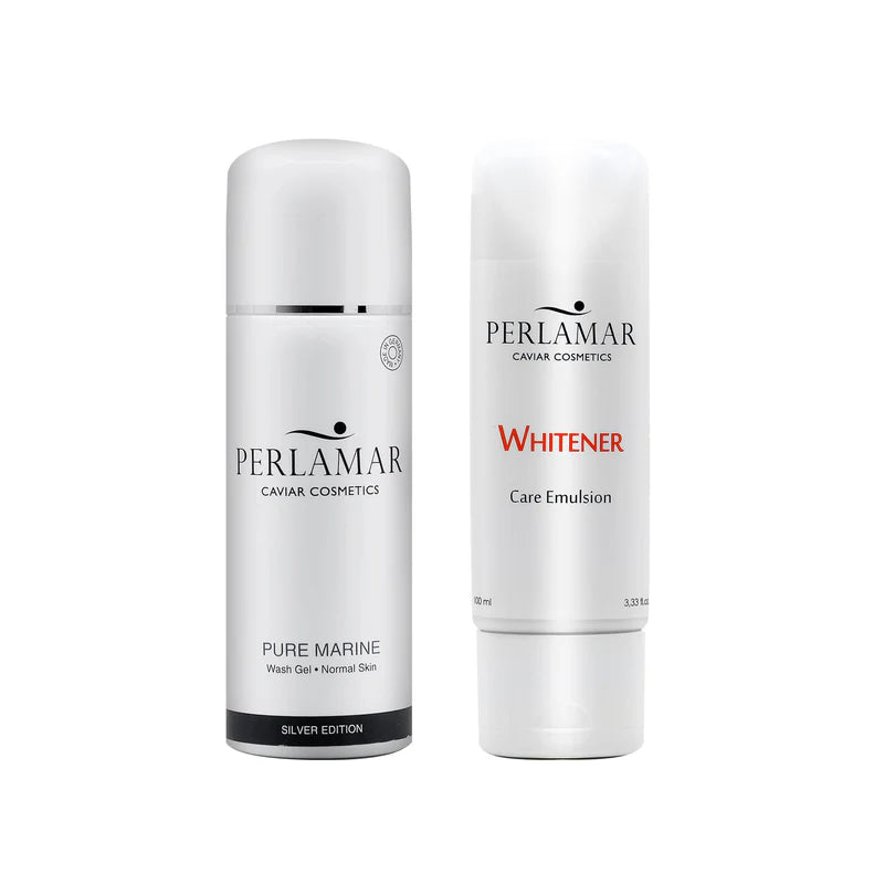 This package includes Perlamar Pure Marine Wash Gel and Perlamar Whitener Emulsion, offering an effective daily routine for deep cleansing, natural brightening, and healthy hydration.